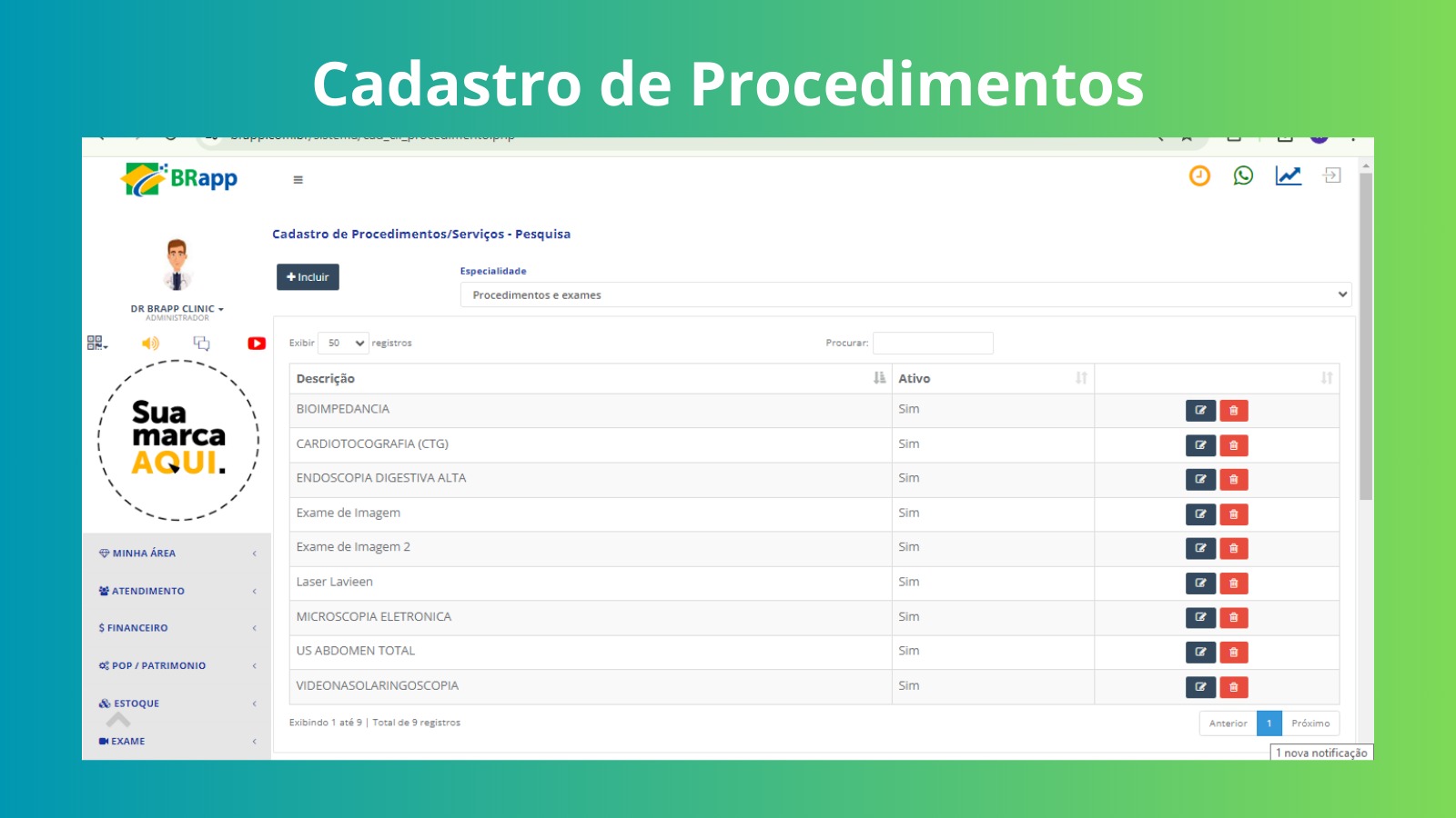Pelo Brapp Clinic, é possível classificar os procedimentos que você realiza no consultório e o tempo destinado a cada um deles. Desta maneira, quando o cliente agendar o horário pela agenda online, o tempo que você reservou para o procedimento já ficará fechado.